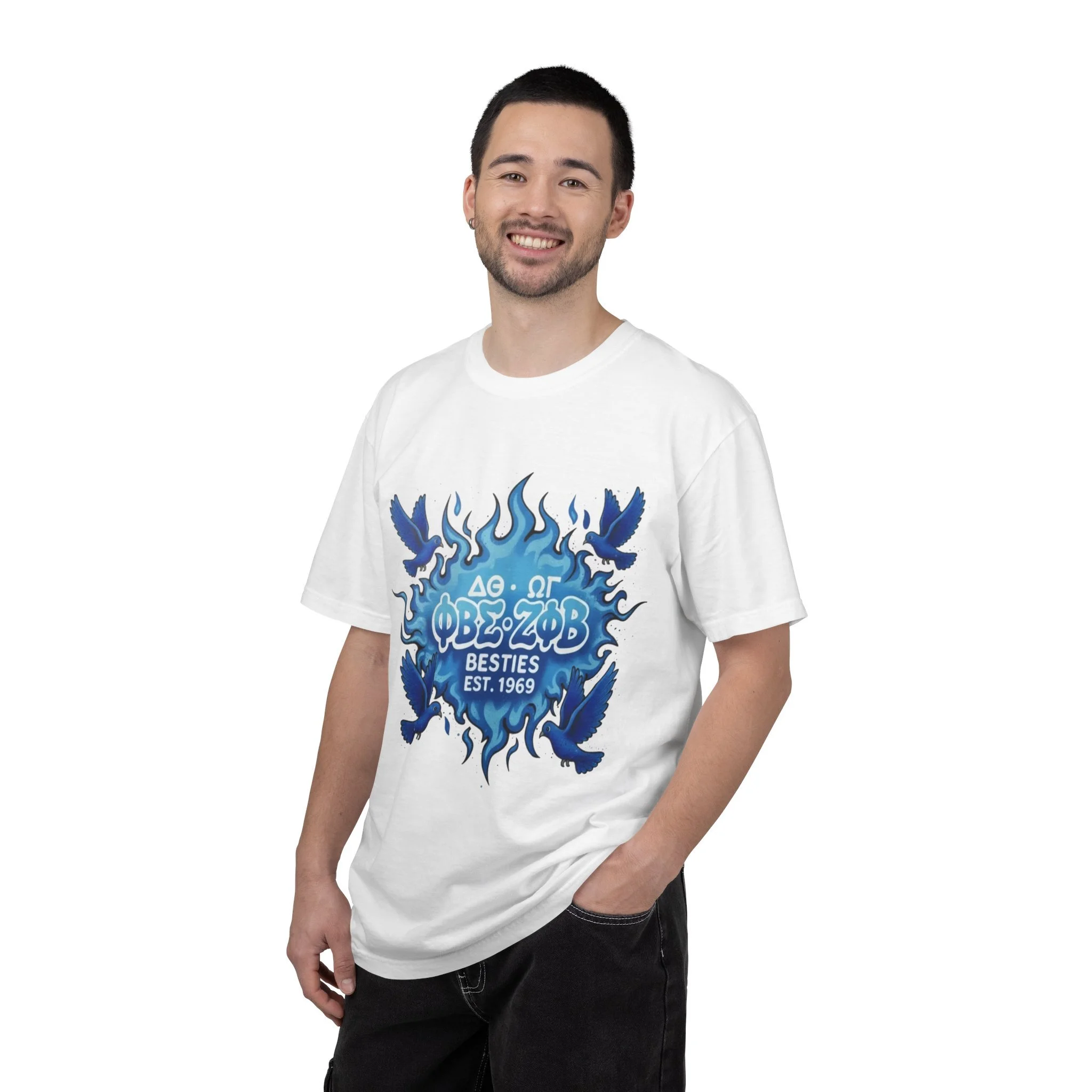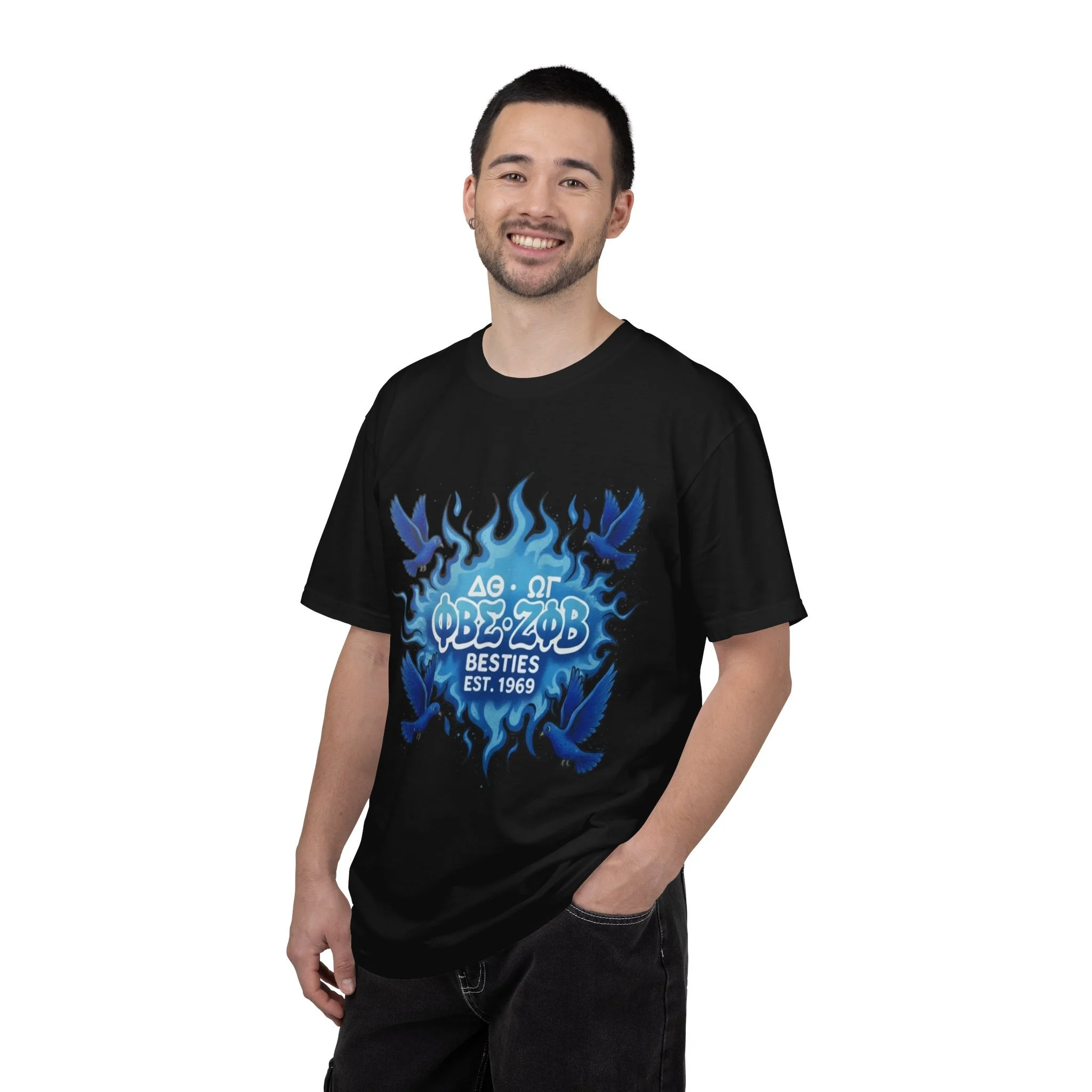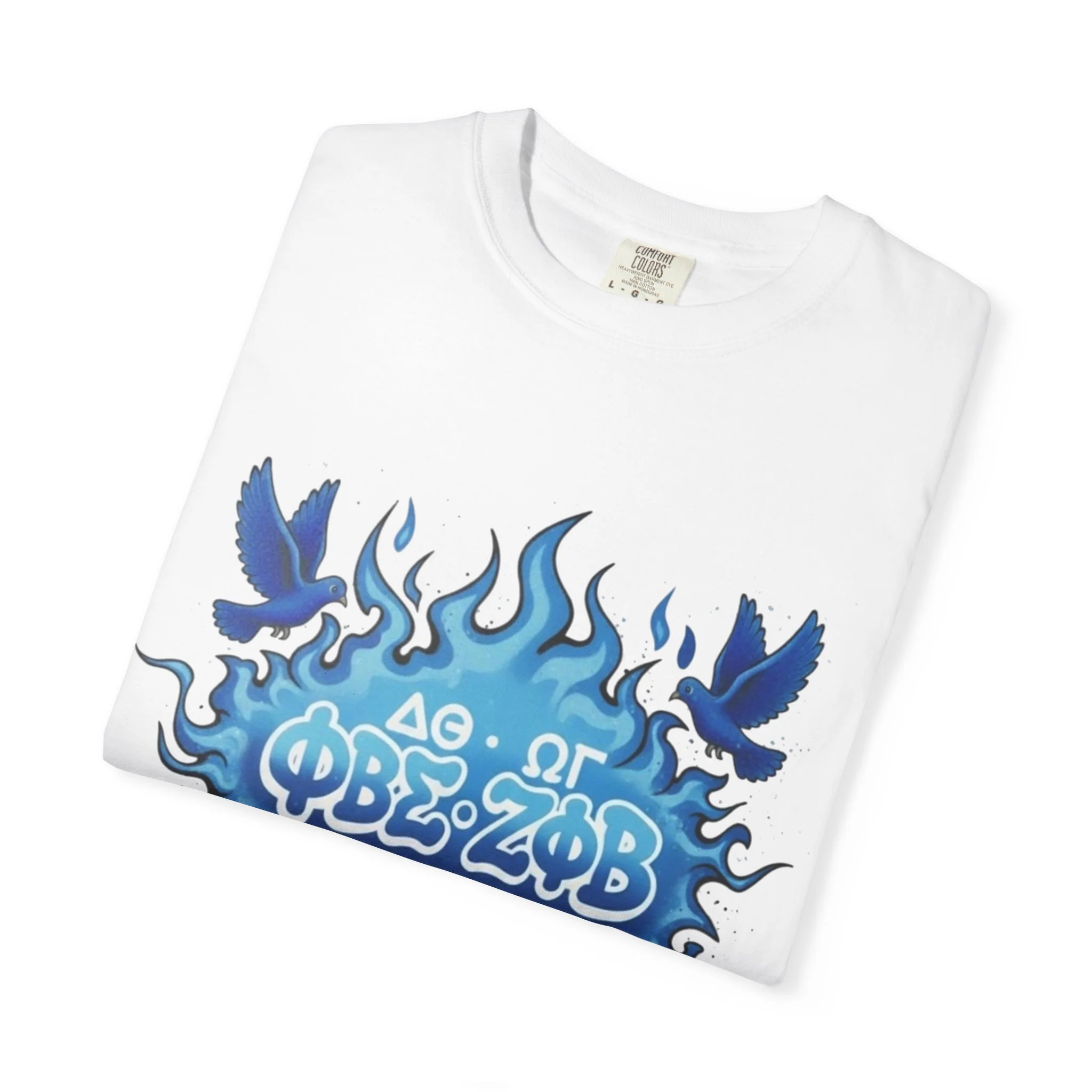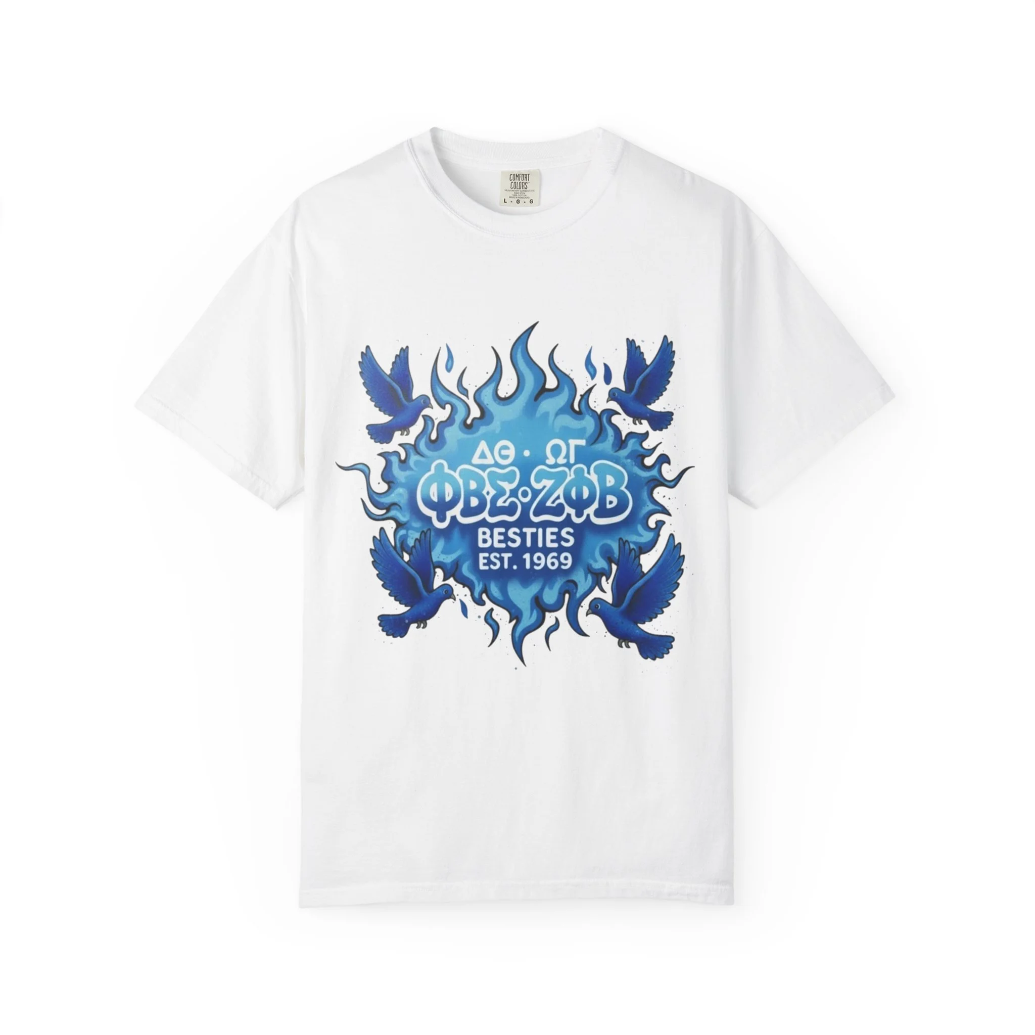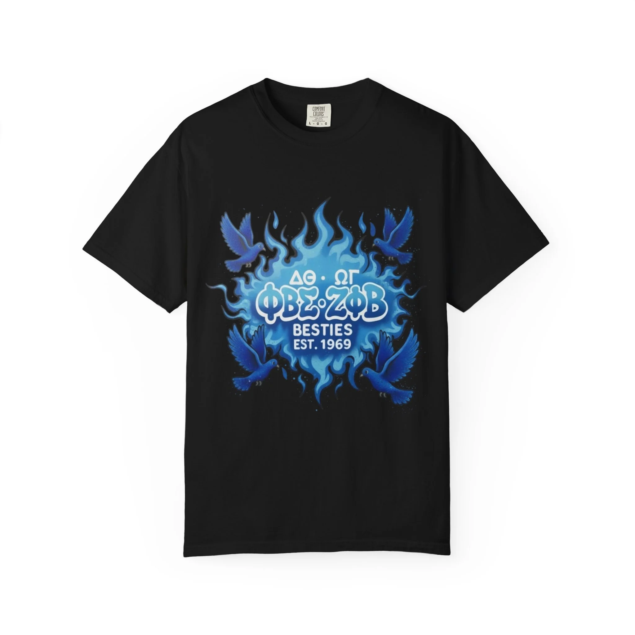 This heavyweight garment-dyed tee brings a worn-in, lived-with vibe to everyday wardrobe rotation. The relaxed fit and soft, post-dye texture make it feel like an old favorite from the first wear. A bold, blue graphic with flame and bird motifs sits center chest, giving the shirt a playful, slightly retro energy that reads like a shared memory or inside joke among close friends. It slips easily into days spent hanging out, road-tripping, or swapping stories at late-night diners — the kind of shirt that becomes part of your bestie rituals.
