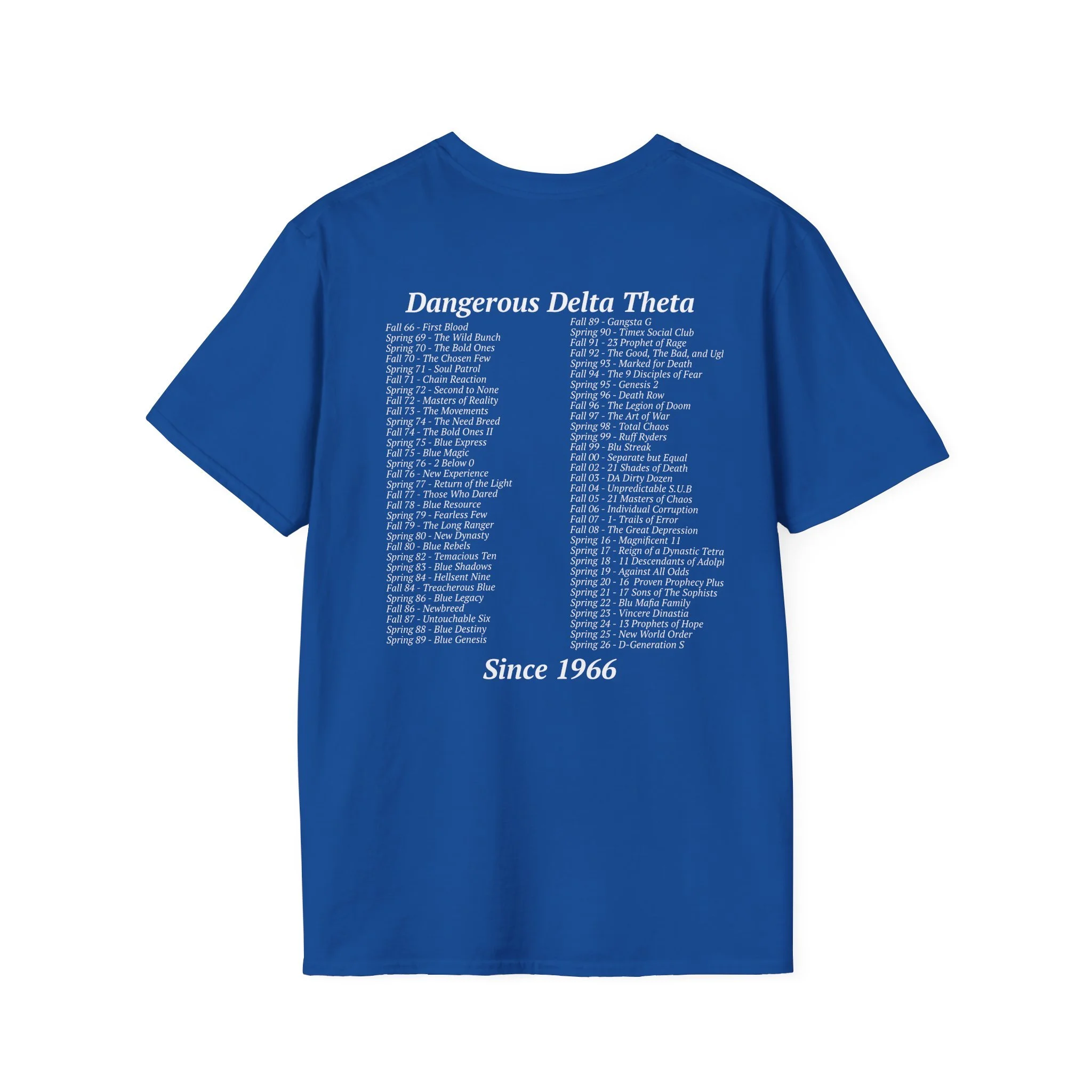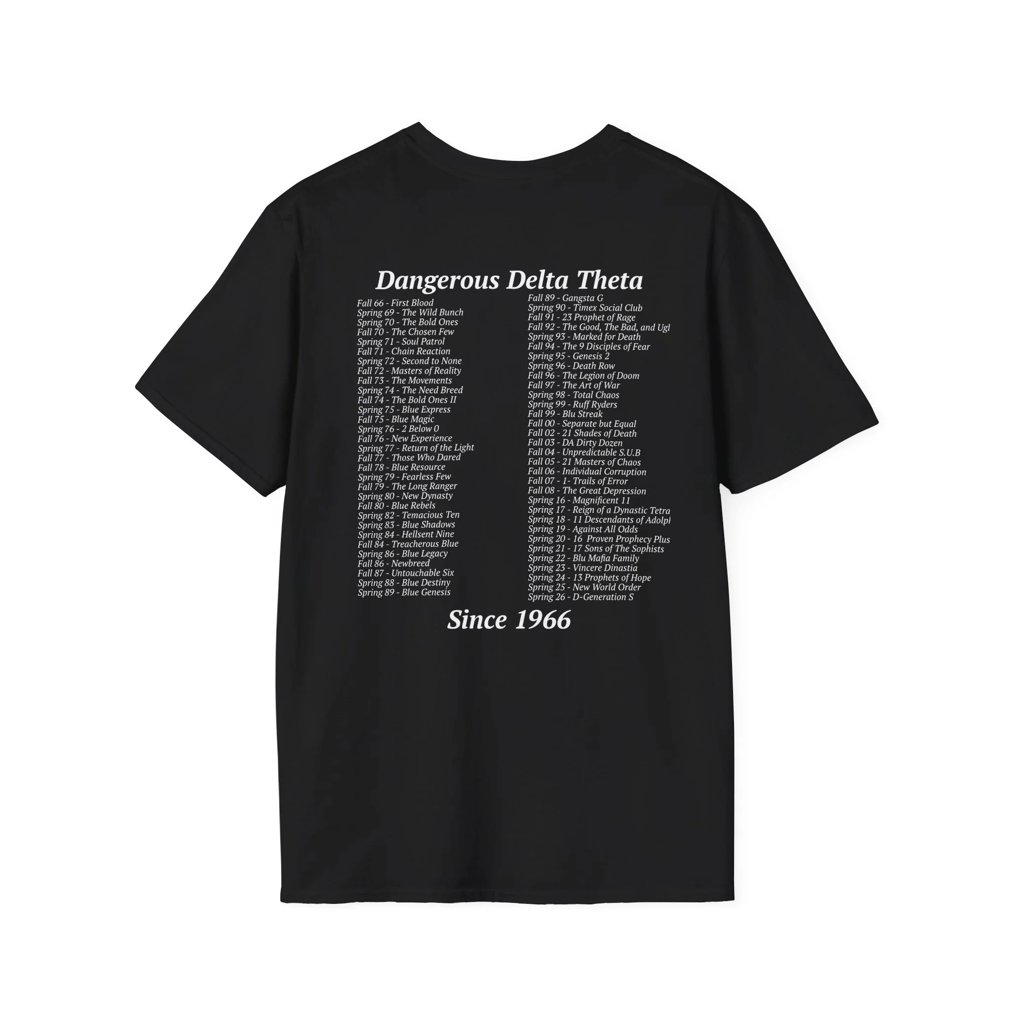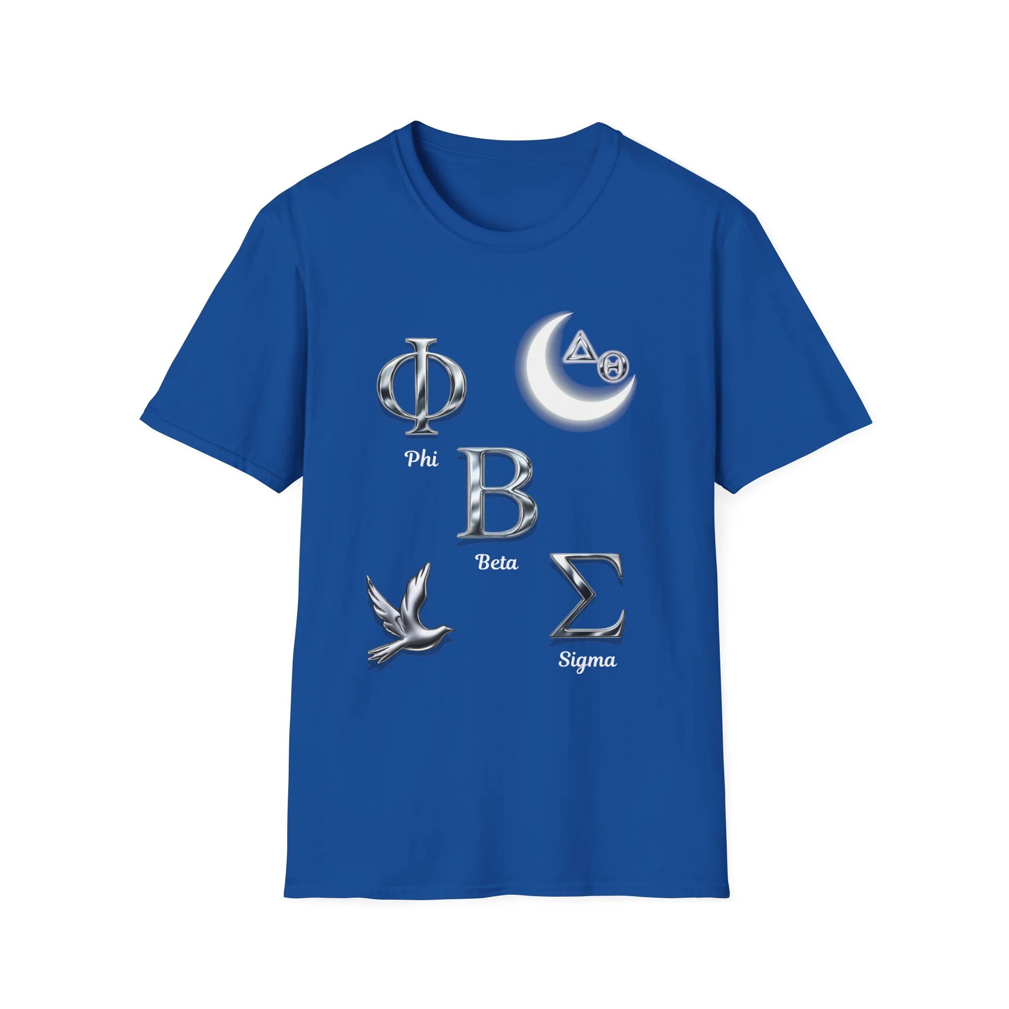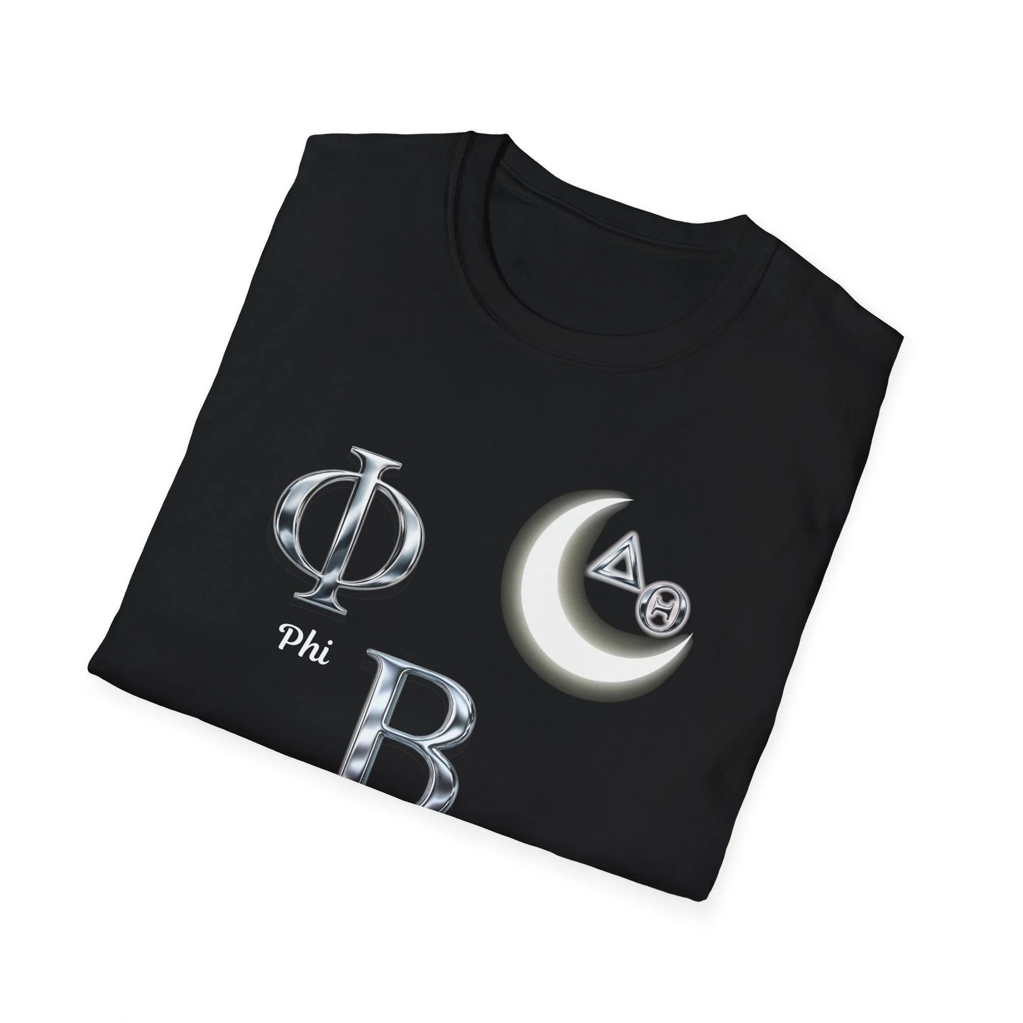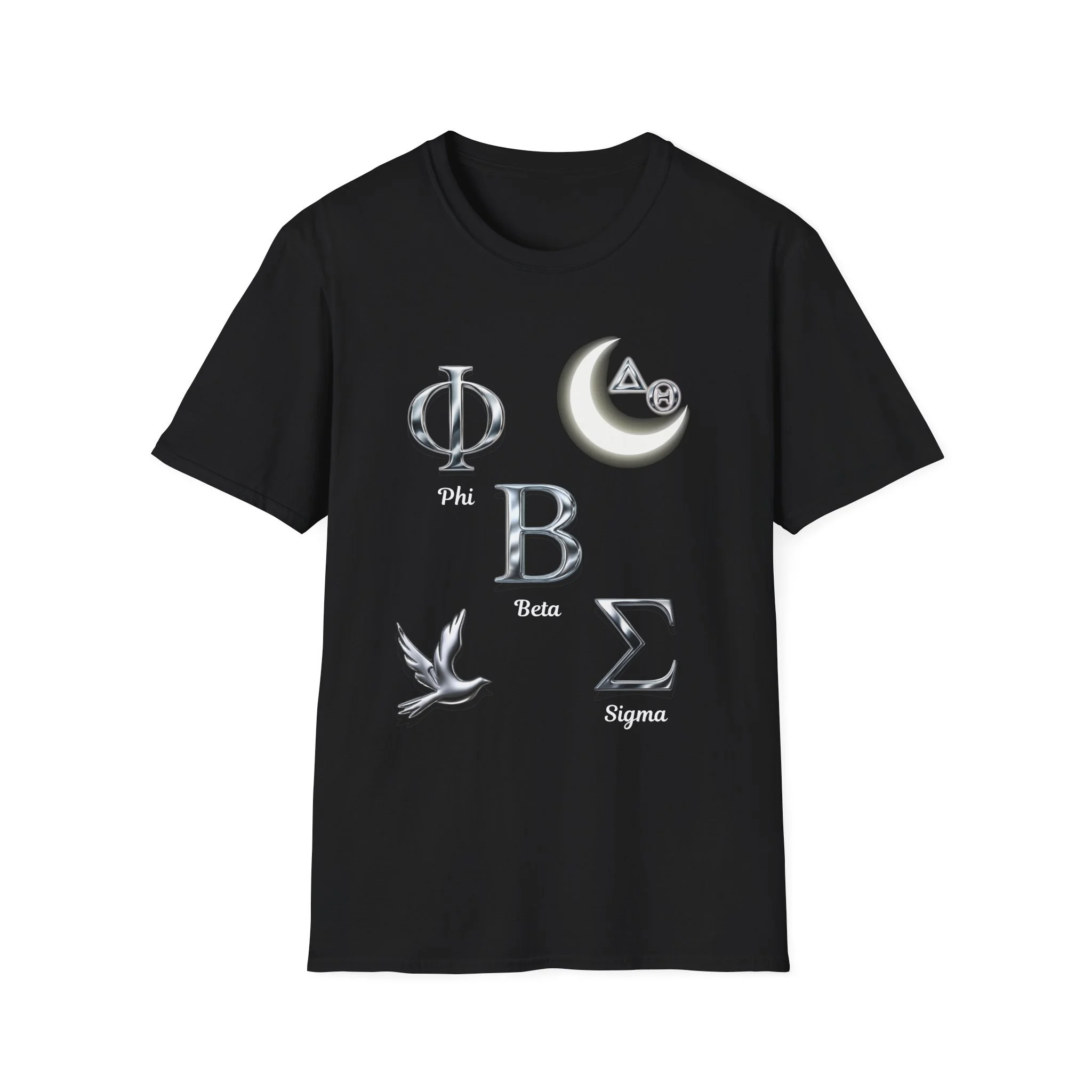 This lightweight crew tee carries a quiet, nostalgic energy — glossy Greek letters and a soft crescent moon float across the chest like fragments of a midnight memory. The front blends reflective, metallic-style symbols with a small dove, giving the shirt a subtle mix of fraternity/sorority iconography and peaceful, nocturnal imagery. The back lists names or words in a low-contrast print, inviting closer inspection and rewarding those who lean in. Wear it to late-night study sessions, alumni meetups, or relaxed campus strolls — it reads like a keepsake you can toss on and feel connected to the people and moments it represents.