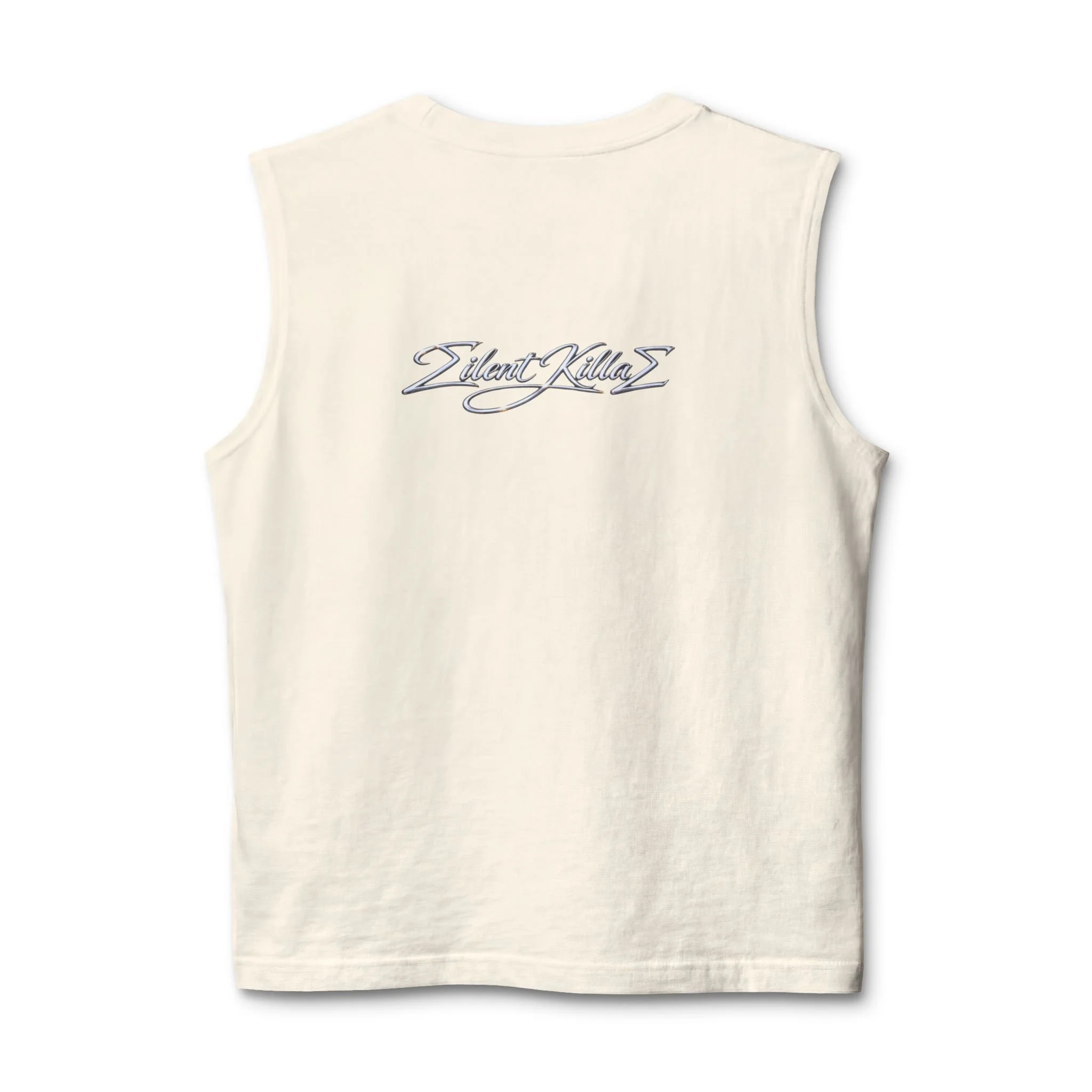 Lightweight and silent in movement — this muscle tank carries a clean, confident energy. The soft white fabric and flowing script graphics read like a personal emblem: understated, deliberate, and a little nostalgic. Wear it on warm training mornings, neighborhood walks, or layered under an open shirt at casual meetups. The sleeveless cut frees your shoulders while the retail fit keeps the silhouette neat. It’s the kind of piece you reach for when you want comfort without losing a composed, intentional look.